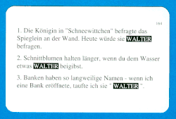 Das Spiel setzt nun bei diesen Karteikarten an und parodiert sie. Auf den Karten stehen drei Sätze mit einem eingeschwärzten Wort. Auf dem schwarzen Balken ist stattdessen „WALTER“ zu lesen. So heißt es beispielsweise auf einer Karte „3. Wäre es nicht lustig, wenn die ersten Astronauten, die ihren Fuss auf den Mars setzen, dort ein(e/n) WALTER fänden?“. Ein Spieler wird zur sogenannten „Sphinx“ und schreibt eine Antwort auf. Diese Antwort ist der wahre Walter. Die Mitspieler müssen nun versuchen diese Antwort zu fälschen. Diese gefälschten Antworten sind dann gefälschte Walter.
