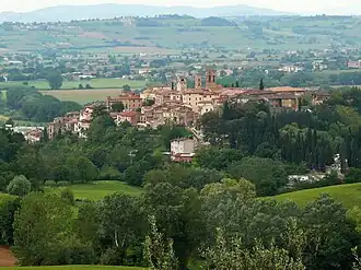 Deruta liegt etwa 15 Kilometer südlich von Perugia auf einem Hügel über dem Tibertal.