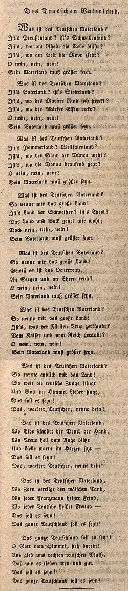 9. „Das Lied vom Deutschen Ausländer“. In: August Heinrich Hoffmann von Fallersleben: Deutsche Gassenlieder. Literarisches Comptoir, Zürich/Winterthur 1843, S. 33 (Online in der Google-Buchsuche).
