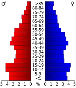 28,9 Prozent der Bevölkerung waren unter 18 Jahre alt, 9,0 Prozent zwischen 18 und 24, 25,2 Prozent zwischen 25 und 44, 22,7 Prozent zwischen 45 und 64 und 14,2 Prozent waren 65 Jahre oder älter. Das Durchschnittsalter betrug 36 Jahre. Auf 100 weibliche kamen statistisch 87,6 männliche Personen und auf 100 Frauen im Alter von 18 Jahren und darüber kamen durchschnittlich 82,9 Männer.