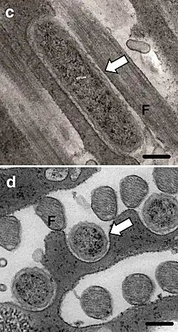 TEM-Aufnahmen von „Ca. D. trichonymphae“ Rs-N31, einem Ektosymbionten von Trichonympha collaris (Parabasalia) im Verdauungstrakt der Termite Zootermopsis nevadensis. | ||||||||||||