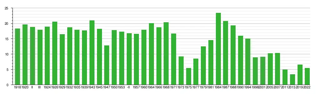 Seit Einführung des Verhältniswahlrechts 1918 (Quelle: Folketingets Oplysning)