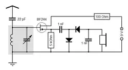 Ein klassischer Detektor entnimmt alle Energie dem Schwingkreis und verringert dessen Gütefaktor, weil der angeschlossene Kopfhörer wie ein parallel geschalteter, niederohmiger Widerstand dämpfend wirkt. Die Folgen: Die Bandbreite wird sehr groß und die HF-Amplitude wird kleiner. Trennschärfe und Lautstärke lassen sich erheblich verbessern, wenn man die Belastung des Schwingkreises durch einen Impedanzwandler reduziert. Der Feldeffekttransistor BF244 hat bei Mittelwelle einen Eingangswiderstand von etwa 1 MΩ, der Ausgangswiderstand liegt bei einigen 1000 Ω. An dieser Stelle kann man einen Spannungsverdoppler anschließen, um höhere Lautstärke zu erreichen. Als Gleichrichter sind nur Germaniumdioden oder Schottky-Dioden geeignet, weil diese ausreichend geringe Schwellenspannungen um 0,2 V aufweisen. Der Widerstand des Kopfhörers soll zwischen 500 Ω und 50 kΩ liegen, notfalls muss ein entsprechender Widerstand eingebaut werden.