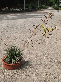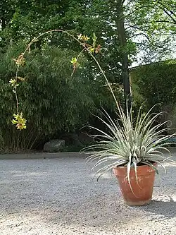 Deuterocohnia meziana mit großen Blattrosetten und langen Blütenständen, an denen über mehrere Jahre Blüten gebildet werden: