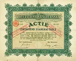 Die Bank wurde auf Veranlassung des Auswärtigen Amts am 12. Februar 1889 mit einem Grundkapital von 5 Millionen Shanghai-Taels gegründet. Das Gründungskonsortium bestand aus folgenden dreizehn Groß- und Privatbanken: Disconto-Gesellschaft, S. Bleichröder, Deutsche Bank, Berliner Handels-Gesellschaft, Jacob S.H. Stern, Norddeutsche Bank, Mendelssohn & Co., Robert Warschauer & Co., Darmstädter Bank für Handel und Industrie, M. A. von Rothschild & Söhne, Preußische Seehandlung, Sal. Oppenheim und Bayerische Hypotheken- und Wechselbank. Sie sollte einerseits dem Handel zwischen Deutschland und Ostasien dienen, andererseits aber auch in das chinesische Eisenbahngeschäft einsteigen und in Dampfschiffe investieren. Zu ihren Hauptaktivitäten zählte das Zeichnen chinesischer Staatsanleihen. Zusammen mit englischen und französischen Banken finanzierte sie chinesische Eisenbahn-Projekte. Die Deutsch-Asiatische Bank zahlte dem Deutschen Reich für die Konzession jährlich 1 % des durchschnittlichen jährlichen Banknotenumlaufs. Sie erhielt 1906 die Konzession für die Ausgabe eigener Banknoten in China. Diese Banknoten gewannen vor allem in Shandong, wo es bis 1912 keine anderen ausländischen Banken gab, an Bedeutung.[1] Infolge der Wirren des Ersten und des Zweiten Weltkriegs wurden das Bankennetz zerschlagen und die Bankaktivitäten eingestellt.