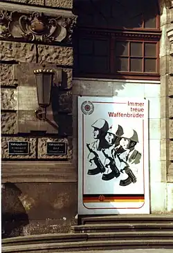 Offizielle Staatsideologie war der Marxismus-Leninismus. In der zeitgeschichtlichen Forschung wird das Herrschaftssystem in der DDR mal als realsozialistisch,[8] mal als kommunistisch[9] bezeichnet. Die Machthaber nannten die DDR einen „sozialistischen Staat der Arbeiter und Bauern“ und deutschen „Friedensstaat“[10] und nahmen für sich in Anspruch, die DDR habe die Wurzeln für Krieg und Faschismus beseitigt. Antifaschismus wurde zu einer Staatsdoktrin der DDR.