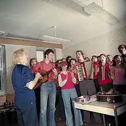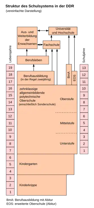 Um die heranwachsenden Generationen zu „sozialistischen Persönlichkeiten zu formen“ und von den Kirchen zu entfremden, begann die SED in den 1950er Jahren einen Kulturkampf gegen die christlichen Kirchen[18] und führte ab 1954 das Ritual der sozialistischen Jugendweihe ein. An dieser quasi-religiösen Ersatzhandlung, als Gegenveranstaltung zu Konfirmation und Firmung, verbunden mit dem Gelöbnis, der DDR zu dienen, nahmen ab den 1970er Jahren annähernd 99 % aller 14-Jährigen teil.[19]