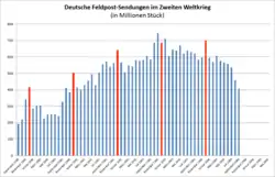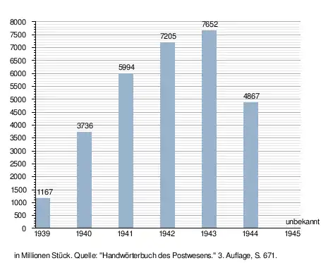 | Deutsche Feldpostsendungen im Zweiten Weltkrieg Sendungen (Nachrichtenpost und Päckchen) nach und aus dem Feld, in Millionen Stück[8]