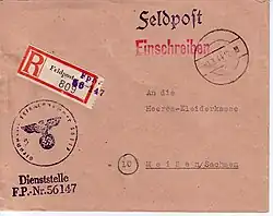 Die Deutsche Feldpost des Zweiten Weltkriegs war ein Teil der zivilen Post, welcher zur Erfüllung einer fachlichen Aufgabe in die militärische Organisation der deutschen Streitkräfte eingegliedert war. Im organisatorischen Bereich unterschied man zwischen regulärer Post aus ziviler Herkunft und der sogenannten Heerespost, zur Kommunikation militärischer Dienststellen und Verbände.[1] Die Feldpost nahm am 2. September 1939 offiziell ihren allgemeinen Dienst auf.[2]