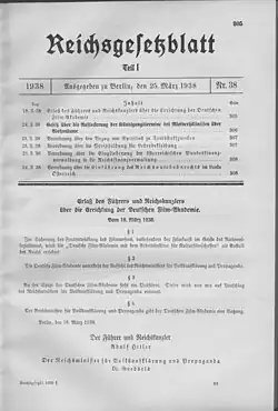 Die auf dem Babelsberger Ufa-Gelände eingerichtete, am 4. März 1938 vom Reichsminister für Volksaufklärung und Propaganda, Joseph Goebbels, eingeweihte und vom November 1938 an schrittweise in Betrieb genommene Deutsche Filmakademie war eine Ausbildungsstätte für Filmregisseure, Drehbuchautoren, Produktionsleiter, Kameraleute und Filmarchitekten. Ausgebildet wurden auch Kostüm- und Trickfilmzeichner.