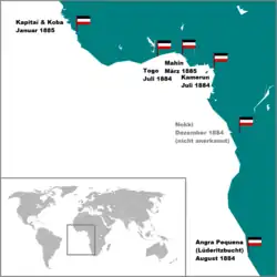 Auch die deutschen Gebietsansprüche in Südwestafrika wurden durch Nachtigal bestätigt. Ansprüche auf die westafrikanischen Gebiete Kapitaï und Koba sowie das Mahinland[10] ließ das Deutsche Reich 1885 zugunsten Frankreichs und Großbritanniens fallen. Zum Ausgleich wurden Gebietszuwächse in Kamerun ausgehandelt. So kam das an der Kamerunküste gelegene Victoria erst zum 28. März 1887 in deutsche Verwaltung, nachdem britische Rechte gegen deutsche Gebietsansprüche in Nigeria und Südafrika eingetauscht worden waren.[11] Dem Versuch Eduard Schulzes, Deutschland eine Kolonie bei Nokki am Kongo zu sichern, blieb die staatliche Unterstützung hingegen von vornherein versagt.[12][13]