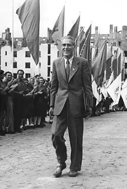 Im August 1956 wurde die KPD vom Bundesverfassungsgericht verboten, obwohl noch im März 1956 ihr Parteivorstand in Folge des XX. Parteitags der KPdSU erörtert hatte, dass in Anlehnung an Chruschtschows Konzept vom „friedlichen Wettstreit der Systeme“ (nach dem die kommunistischen Parteien in Westeuropa auch auf parlamentarischen und nicht allein revolutionärem Weg die politische Macht erreichen könnten) aus dem Parteiprogramm von 1952 Zielsetzungen wie „revolutionärer Sturz des Adenauer-Regimes“ zu widerrufen wären und als strategisch falsche Ausrichtung einzuschätzen wären. Die KPD bekannte sich damit zu den „verfassungsmäßigen Grundrechten und Freiheiten“, die sie als den „Boden“ ihres „Kampfes“ bezeichnete und „entschlossen gegen Verfassungsbruch und autoritäre Willkür“ zu verteidigen behauptete.[14]