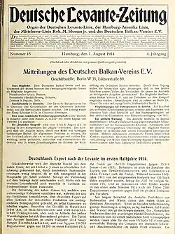 Das Blatt im Hamburger Verlag der Deutschen Levante-Zeitung erschien während des Ersten Weltkrieges in den Jahren 1916 und 1917 zudem zwei Mal monatlich mit dem Untertitel Organ der Deutschen Levante-Linie, der Hamburg-Amerika-Linie, der Mittelmeer-Linie Rob. Sloman jr., der Deutsch-Türkischen Vereinigung, des Deutsch-Bulgarischen Vereins und des Deutschen Balkan-Vereins.[2]