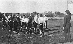 Bereits an den II. Olympischen Spielen, die im Jahr 1900 zusammen mit der Weltausstellung in Paris stattfanden, nahm eine deutsche Mannschaft teil und belegte nach einem 17:27 gegen den Gastgeber Frankreich gemeinsam mit Großbritannien den zweiten Platz. Anstelle einer Nationalmannschaft, die es mangels eines eigenen Verbandes noch nicht gab, nahm der SC Frankfurt 1880 teil.[13] Am 4. November 1900 erfolgte die Gründung des Deutschen Rugby-Fußball-Bundes als eigenständige Abteilung innerhalb des DFB, mit Fricke vom DSV Hannover 78 als erstem Vorsitzenden. Genau ein Jahr später beendete die Rugbyabteilung ihre Beziehungen zum DFB und gründete sich als Deutscher Rugby-Verband (DRV) neu.[9] 1909 folgte die erste Austragung der Deutschen Rugby-Meisterschaft.[14] Obwohl sich der Rugbysport in Frankreich zunächst langsamer entwickelte, fand er mit Baron Pierre de Coubertin, dem Begründer der modernen Olympischen Spiele, einen einflussreichen Förderer, der sich für die rasche Ausbreitung einsetzte. In Deutschland hingegen fehlte ein derart prominenter Unterstützer, sodass die Entwicklung lange Zeit stagnierte und rasch hinter jene von Fußball zurückfiel.[15]