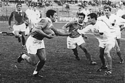 Die deutsche Nationalmannschaft, die nur noch die Bundesrepublik repräsentierte, bestritt am 2. März 1952 in Hannover ihr erstes Test Match nach fast zwölfjähriger Unterbrechung und gewann im Rahmen des Europapokals 1952 mit 16:9 gegen Belgien. Einen Monat später folgte in Padua eine 6:14-Niederlage gegen Italien, was den geteilten dritten Platz ergab.[24] Ebenfalls ab 1952 und bis Mitte der 1980er Jahre gehörten jährlich stattfindende Begegnungen mit den Mannschaften der Britischen Rheinarmee und der RAF Germany zum festen Spielkalender. Die Nationalmannschaft musste bald feststellen, dass sie wegen der Kriegsauswirkungen und der konsequenten Aufbauarbeit der Konkurrenten ihre Stellung auf dem Kontinent mittlerweile eingebüßt hatte. Beispielsweise gab es von 1954 bis 1977 jedes Jahr ein Spiel gegen die Franzosen, die stets mit einer B-Auswahl antraten und dennoch jede Partie für sich entschieden (mit Ausnahme eines Unentschiedens im Jahr 1958). Italien und Rumänien spielten ebenfalls auf einem höheren Niveau, während Spanien mindestens ebenbürtig war. Im September 1956 unternahmen die Deutschen eine Großbritannien-Tour, wobei sie die drei Spiele gegen die Vereine Cardiff RFC, Swansea RFC und Harlequins jeweils klar verloren.[25]