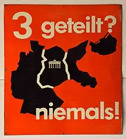 Nach dem Austritt der Sowjetunion aus dem Alliierten Kontrollrat waren wichtige Schritte auf dem nun nur noch förmlichen Weg zur Teilung die nicht angekündigte Währungsreform 1948, die darauf als Antwort folgende Berlin-Blockade vom 24. Juni 1948 bis zum 12. Mai 1949, und letztlich die Gründung der Bundesrepublik Deutschland (BRD) im Westen am 23. Mai 1949 und der Deutschen Demokratischen Republik (DDR) im Osten am 7. Oktober 1949.