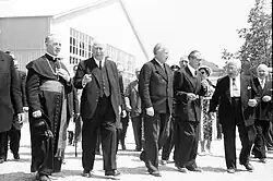 Ebenfalls im Freigelände befand sich ein Pavillon in dem sich die Alwegbahn[38], eine Einschienenbahn, präsentierte. Ausgestellt war allerdings nur „ein Fahrgestell des Originalmeßzuges“.[39] Der Ausstellungskatalog resümiert: „Dem ernsthaften Interessenten, der sich ausführlich informieren will, sei der Besuch des Versuchsfeldes der ALWEG-Forschung in Köln angeraten“.[40]