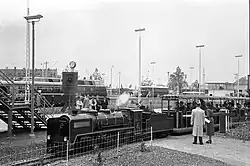 - Die DB betrieb eine 1.500 m lange Parkeisenbahn („Liliputbahn“) mit einem Rundkurs auf dem Ausstellungsgelände. Sie hatte drei Haltestellen: eine am Haupteingang, eine bei den Ausstellungshallen der Bahn und eine am Freigelände „S“. Weiter durchfuhr sie einen Tunnel unter dem Pavillon „T“.[42] An der Strecke der Bahn wurden auch zwei automatische Sicherungsanlagen für unbeschrankte Bahnübergänge in Betrieb demonstriert.[43] Befahren wurde die Strecke von drei Dampflokomotiven, die der Schnellzuglokomotive Baureihe 01 nachgebildet waren und Züge mit je 10 Wagen zogen.[44]