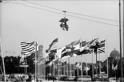 - Eine eigens für die Ausstellung installierte Luftseilbahn hatte bei einem Höhenunterschied von nur 11 m eine Länge von 900 m und acht Stützen. Die Antriebsstation, in der ein Motor von 40 PS (ca.: 30 kW) arbeitete, befand sich auf der Theresienwiese. Von hier führte das Seil zu einer Spannstation auf dem Messegelände. In einer Mittelstation, ebenfalls auf dem Ausstellungsgelände, wurde die Fahrtrichtung um etwa 150° umgelenkt. Fahrzeuge waren 60 Gondeln unterschiedlicher Bauart. Die Fahrt dauerte etwa 6 Minuten. Je Richtung und Stunde konnte die Bahn bis zu 600 Personen befördern.[45]