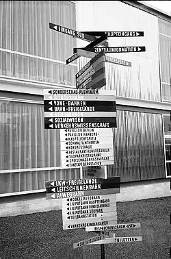 | N | Deutsche Bundesbahn: Haupthalle und Modelleisenbahn, Hochbau; Gaststätte aus zwei Speisewagen vor der Halle | Die Präsentation war nach den Stichworten „Sicher“, „Schnell“, „Bequem“ und „Leistungsfähig“ aufgebaut und gegliedert: Schnell:Expressgutbeförderung, einschließlich Flugeisenbahnverkehr (Flei)[Anm. 6], Fernschnellzug-Netz[15] Bequem: Anpassung des Platzangebots durch Verkehrsbeobachtung; Service am Bahnhof; Güterverkehr: Transportbehälter, Kühltransporte, Großmodell der Güterabfertigung in Heilbronn Leistungsfähig: Fernkonferenzanlage über das bahneigene Telefonnetz (BASA), zentrale Steuerung der Uhren der DB, Hamburger Vorortverkehr, Kohle-Verkehr aus dem Ruhrgebiet, Muster-Planungen, unter anderem zum Umbau von Braunschweig Hauptbahnhof in einen Durchgangsbahnhof, ein ähnliches Projekt für Heidelberg Hauptbahnhof, einen neuen Güterbahnhof für Bremen, eine unterirdische S-Bahn-Station unter dem Stachus in München, Tunnel- und Brückenbau.[16] Sicher: Modellbahnanlage in Spur 0 (Spurweite 32 mm) auf 600 m², 1.300 m Gleisen, je 170 Weichen und Signale, 700 Oberleitungsmaste und 2.500 Relais. Die Modellbahnanlage simulierte Echtbetrieb. Bedient wurde die Anlage von drei „echten“ Drucktastenstellwerken, enthielt einen Trajektbetrieb und einen Ablaufberg. Es verkehrten 30 Triebfahrzeuge[Anm. 7], 60 Personenwagen und 170 Güterwagen. Neben der Modellbahnanlage befand sich eine Zuschauertribüne für 1.400 Personen.[17] Hochbau: unter anderem Entwürfe zu Fassadengestaltung von München Hauptbahnhof, Modell des Neubaus für ein Empfangsgebäude in Bad Reichenhall[18] |