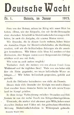 Am 27. Januar 1915 erschien die erste Ausgabe der Deutschen Wacht, am Geburtstag des deutschen Kaisers Wilhelm II. Sie sollte die deutschen Sichtweisen im Ersten Weltkrieg wiedergeben, die durch die niederländischsprachigen Medien in der Kolonie nicht vertreten wurden (Einleitung der ersten Ausgabe). Herausgeber war der ebenfalls an diesem Tag neu gegründete Deutsche Bund in Niederländisch-Indien, als Vertretung der etwa 3.000 Deutschen in der Region. Ende 1915 gab es 1.200 Abonnenten.[1]