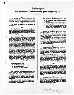 In §1 der Satzung vom 3. März 1920 hieß es: „Der Deutsche Demokratische Presseverein hat den Zweck, die deutsche demokratische Presse durch Beratung, Mitarbeiter und Finanzierung zu fördern.“ Laut Satzung waren die Vereinsorgane die Mitgliederversammlung, der Hauptausschuss sowie der oder die Geschäftsführer. Der Hauptausschuss bestand aus mindestens fünf und höchstens 20 Mitgliedern. Ein Drittel der Mitglieder musste alljährlich ausscheiden und war durch Neuwahl zu ergänzen. Die Reihenfolge des Ausscheidens bestimmte das Los.[9]