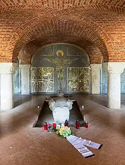 Der Zugang zum Friedhof erfolgt durch die Krypta. Auf der Krypta steht eine Kreuzigungsgruppe. Die einzelnen Figuren der Gruppe, Maria und Johannes, sind 3,30 m groß und wiegen jeweils sieben Tonnen. Im Innern der Krypta ist symbolisch die Statue eines Soldaten aufgebahrt, an der regelmäßig Kranzniederlegungen durch ausländische Staatsvertreter erfolgen.