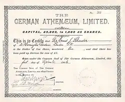 Der Deutsche Verein für Kunst und Wissenschaft, London (auch: Deutsches Athenäum London) wurde 1869 von deutschen Künstlern und Literaten unter maßgeblicher Beteiligung von Gottfried Kinkel gegründet.[1] Es handelte sich um einen elitären Zusammenschluss von Deutschen in London, die der mittleren bis oberen Gesellschaftsschicht angehörten. Dies spiegelt sich in den für die Zeit recht hohen Mitgliedschaftsbeiträgen wider: Nach einer einmaligen Beitrittszahlung von zunächst 15 Guineen zahlten Wissenschaftler, Künstler und Autoren 4 Guineen jährlich, alle sonstigen Mitglieder aber 6 Guineen pro Jahr.[2][3] Später wurde die Mitgliedschaft durch den Ankauf eines Anteilsscheins erworben, von denen insgesamt 1.000 Stück im Nennwert von je £5 ausgegeben wurden.