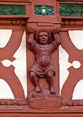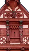 Bei der Wandbemalung sind im zweiten Obergeschoss die an den Hausecken in Nischen stehenden Personen als Christus und weibliche Allegorie des Glaubens zu deuten. Für die Renaissance typisch sind ebenso die Maskengesichter der Konsolen, die Pfostenschnitzereien und die bewehrten Atlanten in den Geschossbrüstungen, die wie aus Stein gemeißelt wirken.