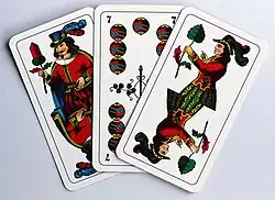 - Solo: ein Spieler gegen die drei Mitspieler, der Alleinspieler (daher der Name Solo) bestimmt die Farbe, die Trumpf ist. Er muss mindestens 4 Stiche erhalten.