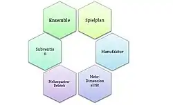 Die Theater in Deutschland sind Manufakturen mit bis zu hundert unterschiedlichen Berufen unter einem Dach. Einige Theaterberufe sind schon nahezu ausgestorben, wie Hut-, Putz- oder Schuhmacher, Rüstmeister und Kascheure.[21] In einem Theaterbetrieb vereinen sich künstlerische, technische, administrative als auch handwerkliche Berufsgruppen. Sie alle wirken an der Entwicklung der Ideen und deren Umsetzung bis hin zur Präsentation auf der Bühne mit. Nur die Wenigsten von ihnen sind für die Zuschauer sichtbar.[22]