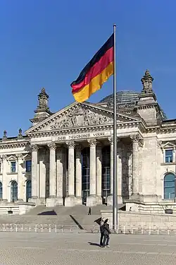 Funde des Homo heidelbergensis sowie zahlreicher prähistorischer Kunstwerke aus der späteren Altsteinzeit belegen, dass seit 600.000 Jahren Menschen auf dem Gebiet des heutigen Deutschland leben, einige Steinwerkzeuge wurden sogar auf über 1,3 Millionen Jahre datiert.[7] Während der Jungsteinzeit, um 5600 v. Chr., wanderten die ersten Bauern aus Vorderasien ein. Die Römer bezeichneten die Siedlungsgebiete der germanischen Stämme in der Antike als Germania magna. Durch die Eroberungen Karls des Großen wurden weite Teile des heutigen Deutschland um 800 erstmals in einem Herrschaftsgebiet zusammengefasst. Infolge der Teilungen des Fränkischen Reichs unter Karls Enkeln entstand im 9. Jahrhundert das Ostfrankenreich, das ab dem 10. Jahrhundert auch als Regnum Teutonicum bezeichnet wurde und aus dem das bis 1806 bestehende Heilige Römische Reich Deutscher Nation hervorging. An dessen Stelle wiederum trat 1815 der Deutsche Bund, der sich aus lose miteinander verbundenen souveränen Staaten zusammensetzte. Nach der gescheiterten Märzrevolution von 1848 kam es erst 1871 zur Gründung eines deutschen Nationalstaats, des Deutschen Reichs.