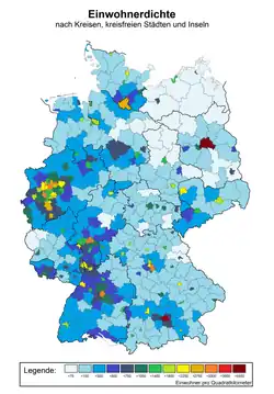 In Deutschland werden Verdichtungs- und Ballungsräume (Agglomerationen) nicht statistisch genau abgegrenzt. Es gibt (Stand 31. Dezember 2024) 80 Großstädte (ab 100.000 Einwohner), davon 15 mit mehr als 500.000 Einwohnern, historisch bedingt überwiegend im Westen und Südwesten Deutschlands. Diese entlang des Rheins verlaufenden Ballungsräume bilden den Mittelteil der zentralen europäischen Bevölkerungskonzentration (Blaue Banane). Die meisten Agglomerationen sind monozentrisch, das Ruhrgebiet hingegen ist eine (polyzentrische) Konurbation. Mit seinen zahlreichen Zentren hat Deutschland, anders als etwa die Nachbarländer Österreich mit seiner Hauptstadt Wien und Dänemark mit Kopenhagen, keine Primatstadt. Trotz der Vielzahl großer Städte lebte zum 31. Dezember 2024 etwas weniger als ein Drittel (26,8 Millionen) der Einwohner Deutschlands in Großstädten. Nahezu 15 Millionen Einwohner leben in den 15 deutschen Städten mit mehr als einer halben Million Einwohnern, was etwa 18 % aller Einwohner entspricht.[69][70]
