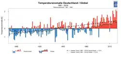 Auswertungen der Wetterbeobachtungen zeigen, dass die mittlere Temperatur in Deutschland im Zeitraum 1881 bis 2022 um ca. 1,7 °C gestiegen ist (linearer Trend), während der weltweite Temperaturanstieg (über See- und Landflächen) im gleichen Zeitraum nur 1,1 °C betrug.[30]