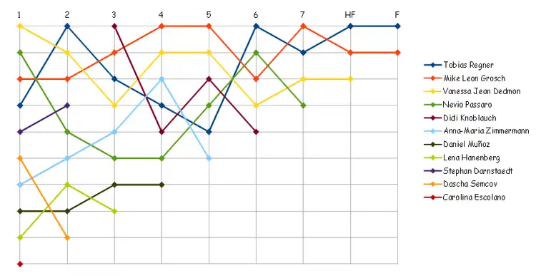 | Platz | Kandidat | Ausgeschieden am | Motto |
