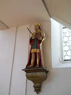 In der Kirche befinden sich außerdem eine Vitusstatue und eine Mondsichelmadonna aus dem 17. Jahrhundert sowie ein aus der Ellinger Franziskanerkirche stammendes lebensgroßes Kruzifix mit Madonna, flankiert von vier Putten mit den Leidenswerkzeugen (um 1730).[8] Zwölf Apostelkreuze in der Form von schwarzen, golden gerandeten Deutschordenskreuzen markieren die Stellen, an denen bei der Kirchenweihe der Bau vom Bischof mit Chrisam gesalbt wurde. Die klassizistische Kirchenorgel auf der Empore wurde 1863 vom Eichstätter Orgelbauer Joseph Bittner geschaffen; sie besitzt zwei Manuale und 10 Register und wurde 1993 überholt.[2]