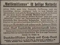 Der Deutschvölkische Schutz- und Trutzbund (DVSTB) war nach zeitgenössischer staatlicher Einschätzung „der größte, tätigste und einflußreichste antisemitische Verband in Deutschland“[1] nach dem Ersten Weltkrieg und einer der größten und wichtigsten Vertreter der völkischen Vereinigungen in der Weimarer Republik, deren demokratisch-parlamentarisches System er radikal ablehnte.