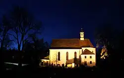 Die weiß verputzte, annähernd geostete Saalkirche ist am östlichen Rand des Wohngebiets in Hanglage errichtet. Sie steht in der Nordwestecke eines ummauerten Friedhofgeländes. Das Kirchenschiff wird durch ein steiles Satteldach abgeschlossen und an den Langseiten durch je drei hohe, schmale Rundbogenfenster belichtet. Im Westen dient ein niedriger Anbau als Eingangsbereich. Das geschwungene Mittelstück des Dachs wird durch einen Mittelrisalit hervorgehoben, in dem ein Fenster mit Stichbogen eingelassen ist.