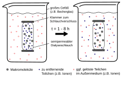 Die Dialyse ist eine Arbeitsmethode im chemischen Labor. Sie dient dazu, kleine Moleküle und Ionen, wie zum Beispiel Salze oder Zucker, auszutauschen, während große Moleküle, wie zum Beispiel Proteine oder Nukleinsäuren, zurückgehalten werden.