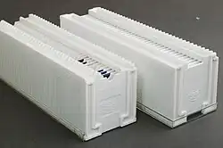 Das ist das am häufigsten verwendete Magazin. Es gibt Universalmagazine für 50 und für 36 Dias. Die Magazine können Dias von bis zu 3,2 mm Dicke aufnehmen. Dünnere Dias, wie z. B. die Papprahmen von Kodak oder CS-Rahmen (siehe unten) werden darin aber nicht in senkrechter Position gehalten, was bei manchen Diaprojektoren oder besonders bei den Magazinscannern von Reflecta zu Problemen führen kann. Das Dia wird nur an zwei Seiten umschlossen; kippt das Magazin um, fallen die Dias heraus.