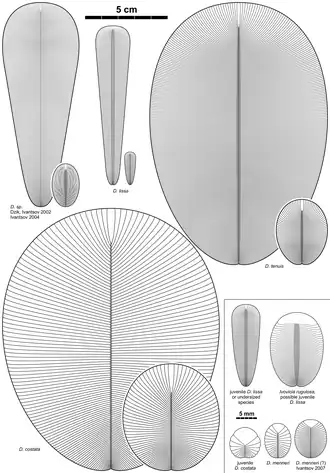 Verschiedene Dickinsonia-Arten (Rekonstruktionen) | ||||||||||