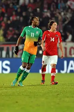 Didier Drogba (links) neben Julian Baumgartlinger am 14. November 2012 im Länderspiel gegen Österreich
