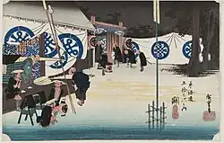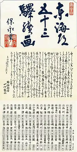 - ↑ Die zuerst veröffentlichten elf Drucke der gemeinsamen Herausgeberschaft der beiden Verleger waren: Nihonbashi 01, Shinagawa 02, Kawasaki 03, Hodogaya 05, Totsuka 06, Hiratsuka 08, Okitsu 18, Mariko 21, Fujieda 23, Nissaka 26 und Fukuroi 28. Der von Tsuruya Kiemon alleine herausgegebene Druck ist Okabe 22.