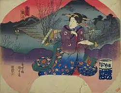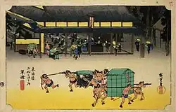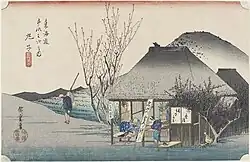 - 1835 in der von Takenouchi Magohachi produzierten Serie „Die 53 Stationen“ (Gojūsan tsugi no uchi, 五十三次之内). Die Blätter der Serie zeigen Schauspieler in Rollen aus dem im selben Jahr aufgeführten Kabuki-Stück „Die 53 Stationen während des Pflaumenfrühlings“ (Ume no haru gojūsan tsugi, 梅初春五十三駅). Sieben Drucke im ōban-Format sind bekannt und alle sieben haben ein kleines Kartuschenbild mit Abbildungen aus Hiroshiges Tōkaidō.[40]