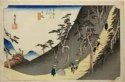 Die sechste annoncierte Serie war „Die 69 Stationen des Kisokaidō“ (Kisokaidō rokujūkyū-tsugi, 木曾街道六十九次), deren Umfang mit insgesamt 70 Blättern sogar noch den der Tōkaidō-Serie übertreffen sollte. In der Bildgestaltung ebenfalls identisch mit jener, sind auf den Drucken der Kisokaidō-Serie die Stationen des Kisokaidō, der Inlandsverbindung von Edo nach Kyōto, dargestellt. Die ersten 20 Drucke dieser Serie sind allerdings von Keisai Eisen gestaltet und wurden 1835/36 durch Takenouchi Magohachi veröffentlicht.[Anm. 4] Unter Beteiligung des Verlegers Iseiya Rihei erschienen um 1836 noch weitere vier von Eisen entworfene Drucke und erst danach war Hiroshige derjenige, der die restlichen 46 Drucke der Serie entwarf. Ende 1836 wiederum schied Takenouchi Magohachi, wahrscheinlich aus finanziellen Gründen, aus diesem Projekt aus, so dass 42 Drucke alleine von Iseya Rihei publiziert wurden. Der Erfolg beim Publikum war weit geringer als der der Tōkaidō-Serie, da der Kisokaidō weniger bereist wurde und der Markt für solche Drucke gesättigt war.[37]