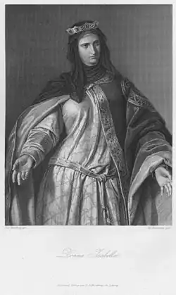 Als Isabella mit dem Mädchen schwanger war, hatte ihr Gemahl einen Traum, welchen ein sternkundiger Araber so deutete, dass die zukünftige Tochter den Untergang des gesamten Geschlechts bewirken werde. Isabella selbst hatte einen anderen Traum, den sie von einem christlichen Mönch deuten ließ. Dieser versicherte ihr, dass die Tochter dereinst ihre streitenden Brüder in Liebe vereinen werde. Der Fürst befahl, das Kind nach der Geburt zu töten, aber Isabella, die der christlichen Traumdeutung mehr Wert beimaß, hielt das Kind in einem Kloster verborgen.