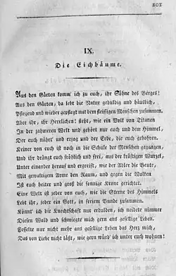 Die Eichbäume ist ein Hexametergedicht von Friedrich Hölderlin. 1796 entworfen, erschien es 1797 in Friedrich Schillers Zeitschrift Die Horen.(1) Nennt der deutsch Germanist Joachim Wohlleben (1936–2004)[1] es einen bescheidenen Lyrismus, ein unscheinbares Gedicht, so habe es doch Epoche gemacht in Hölderlins Lyrik.[2] Nach Momme Mommsen ist es das erste bedeutende Gedicht, das Hölderlins eigenen Ton trägt.[3]