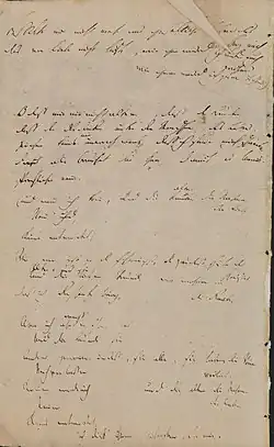 - Hölderlin hat das Gedicht aus den Horen, vermutlich Ende 1799, noch einmal abgeschrieben. Diese dritte Manuskriptfassung, im Konvolut „Stuttgarter Foliobuch - Cod.poet.et.phil.fol.63,I,6“ unmittelbar nach Hölderlins Abschrift der ersten Fassung seiner Elegie Der Wanderer, trägt unter dem Titel den Vermerk „als Proëmium zu gebrauchen“.(6) Die Verse 14 bis 17 sind eingeklammert, und darunter steht ein Prosatext, wohl Entwurf einer Alternative für die eingeklammerten Verse.(7)