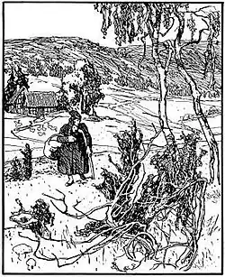 Eine alte Frau lebt in einem Häuschen in der Einöde. Sie versorgt wacker ihre Gänse und ist zu jedermann freundlich, aber die Leute mögen sie nicht besonders und halten sie für eine Hexe. Ein junger Graf begegnet ihr, als sie im Wald Gras und Obst gesammelt hat, und sie lässt es ihn zu ihrem Haus tragen. Dabei macht sie sich über ihn lustig, weil er sich schwerer tut als zuerst gedacht, setzt sich selbst aufs Tragetuch und haut ihm mit Brennnesseln auf die Beine. Zur Belohnung darf er sich auf der Bank vor ihrer Tür in der lieblichen Umgebung ausruhen. Er versteht nur nicht, weshalb die Alte meint, er könnte sich in ihre hässliche alte Tochter verlieben, aber verlässt sie erfrischt mit einem Büchslein aus Smaragd, das ihm die Alte als Geschenk gibt.
