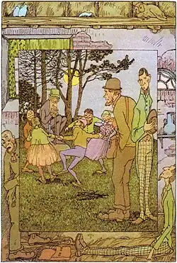 Ein Schneider und ein buckliger Goldschmied begegnen im Mondschein kleinen, singenden Leuten, mit denen sie tanzen. Das Oberhaupt, ein Alter mit eisgrauem Bart, schert ihnen das Haar und schenkt ihnen je einen Haufen Kohlen, die sich über Nacht in Gold verwandeln. Der Goldschmied, der schon zuerst der furchtlosere war, geht noch einmal mit großen Taschen hin. Doch diesmal wird sein Gold wieder zu Kohle, auch das Haar wächst nicht wieder nach und er hat zwei Buckel, einen vorn und einen hinten. Der Schneider teilt mit ihm.